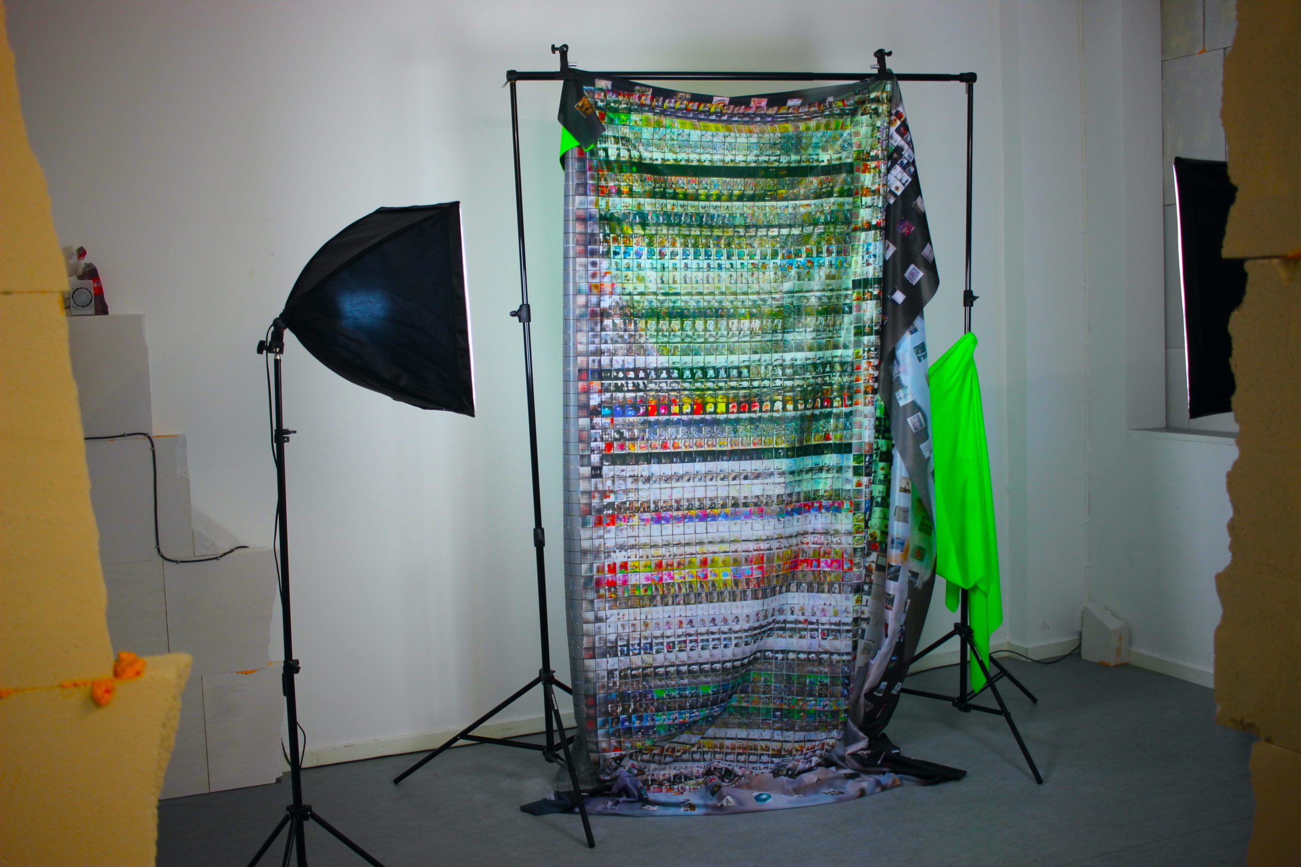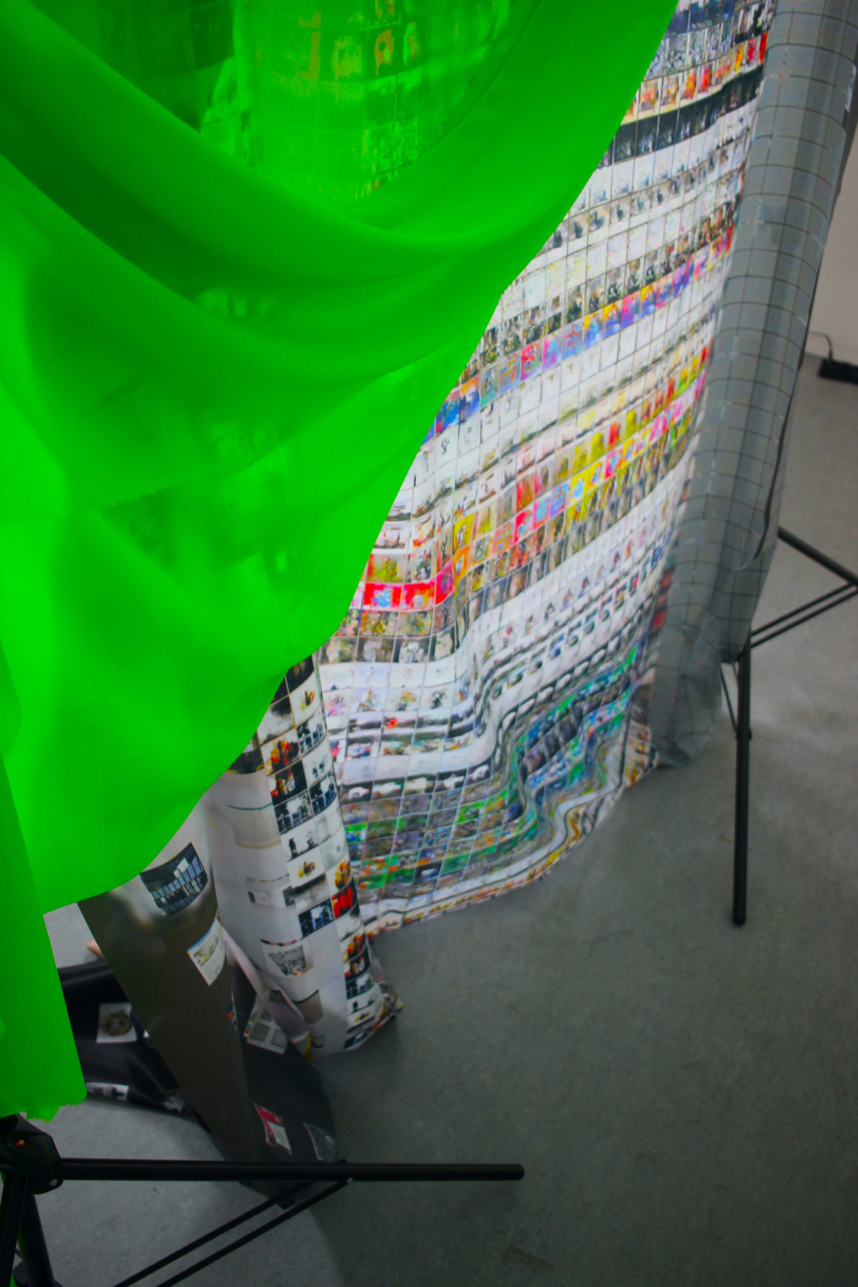 Installation based on the outcome of experimenting with training a generative adversarial network on a dataset composed of every image I had saved in Instagram up to that point. The goal of the project was to see what a machine learning algorithm would produce from a disorderly collection of images I find interesting, hoping for the results to be something like extracting a visual style from an artist’s mood board. Deconstructing Representation documents the process of training the model, cataloguing the input and output images in a large-scale print. Co-opting the sculptural form of the photography studio backdrop, the work plays with how structures inherent to the production of images ultimately influence how they are received.