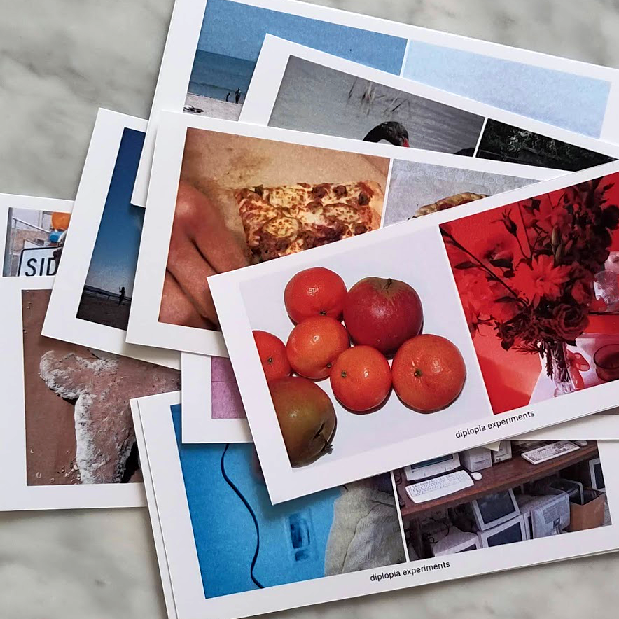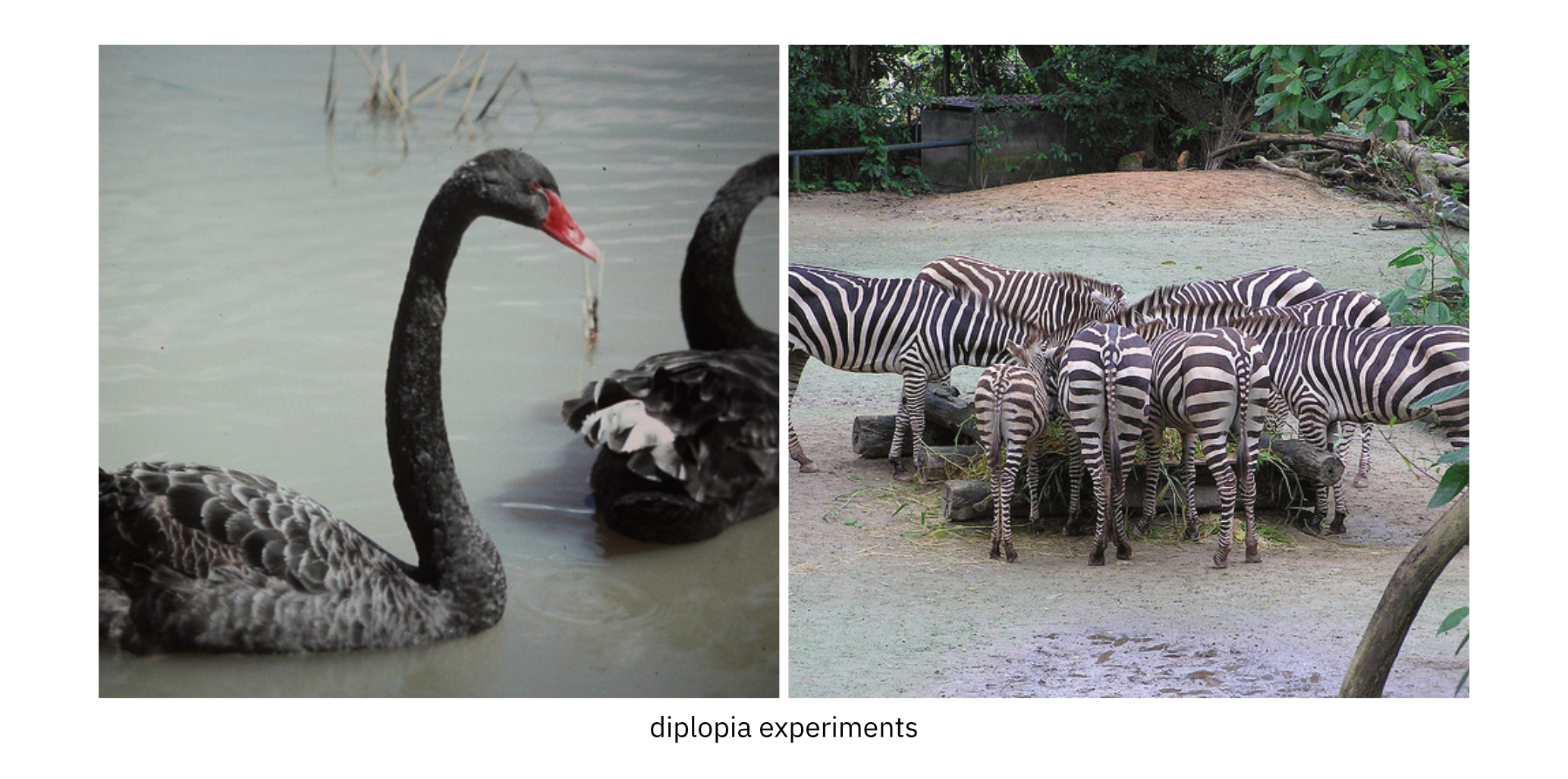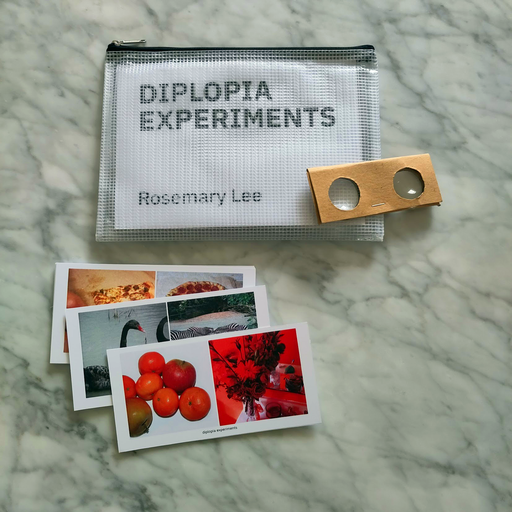 Printed in the form of a series of stereogram cards, the images in Diplopia Experiments are sourced from a machine learning training dataset called COCO (Common Objects in Context). The pairs of different images force the viewer’s eyes to selectively combine them into one, generating a “new” image. The process is a metaphorical interpretation of how machine learning systems work – taking existing things and hallucinating something else on that basis. The new images combine fragments from the original input images in unpredictable and idiosyncratic ways. What viewers see will differ from person to person as each viewer creates their own virtual images from the printed sets of images. The perceived images are to some extent a recreation of the original images, with the addition of an unpredictable “something else.” The viewing distance of the images through a stereoscope is also highly variable, meaning that viewers must experiment with adjusting their body in relation to the work.