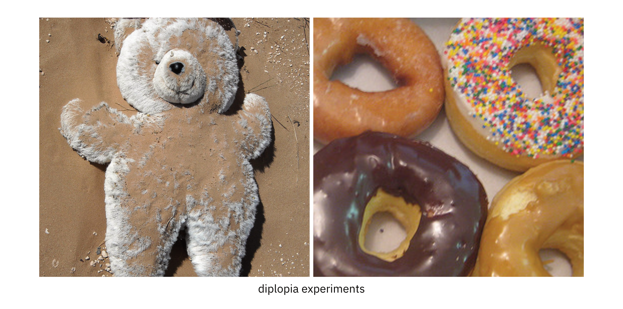 This project explores parallels between human and machine visual interpretation. The title of the work Diplopia Experiments references the medical term for double vision, where viewers perceive two images of the same thing at once. Each kit includes a set of stereogram cards with instructions and materials to build a DIY stereoscopic viewer. The format of the stereogram cards is based on those produced for stereoscopes in the early 1900’s. At the turn of the last century, optical gadgets were popular novelties, which draws a parallel with the current position of machine learning image generators.