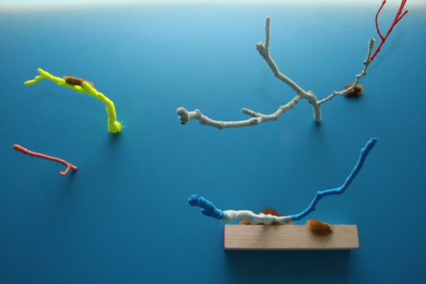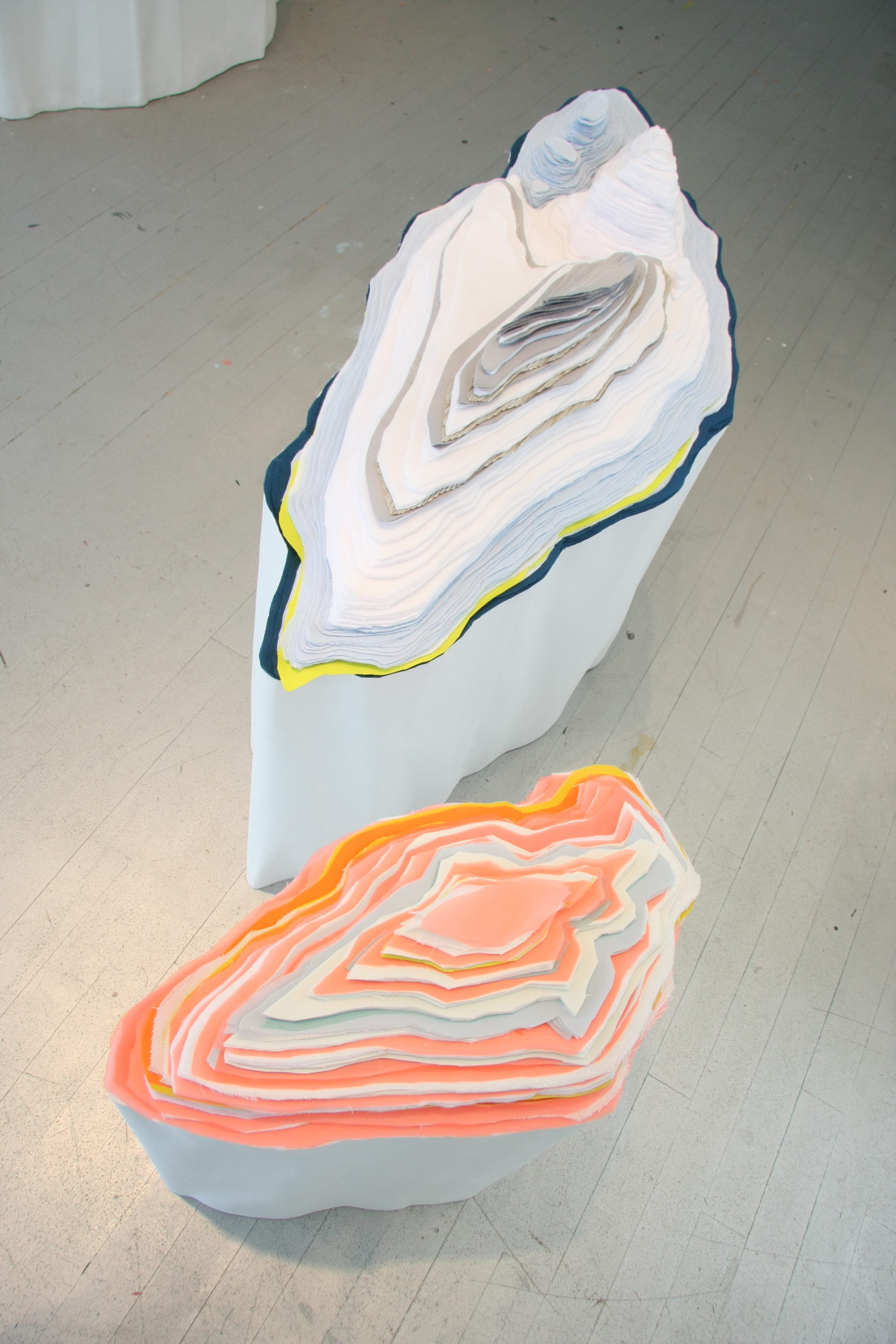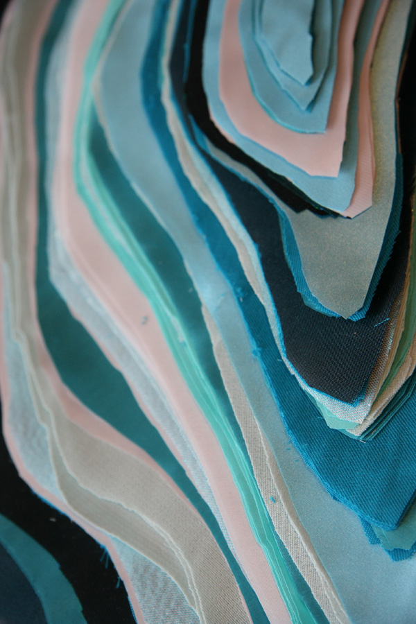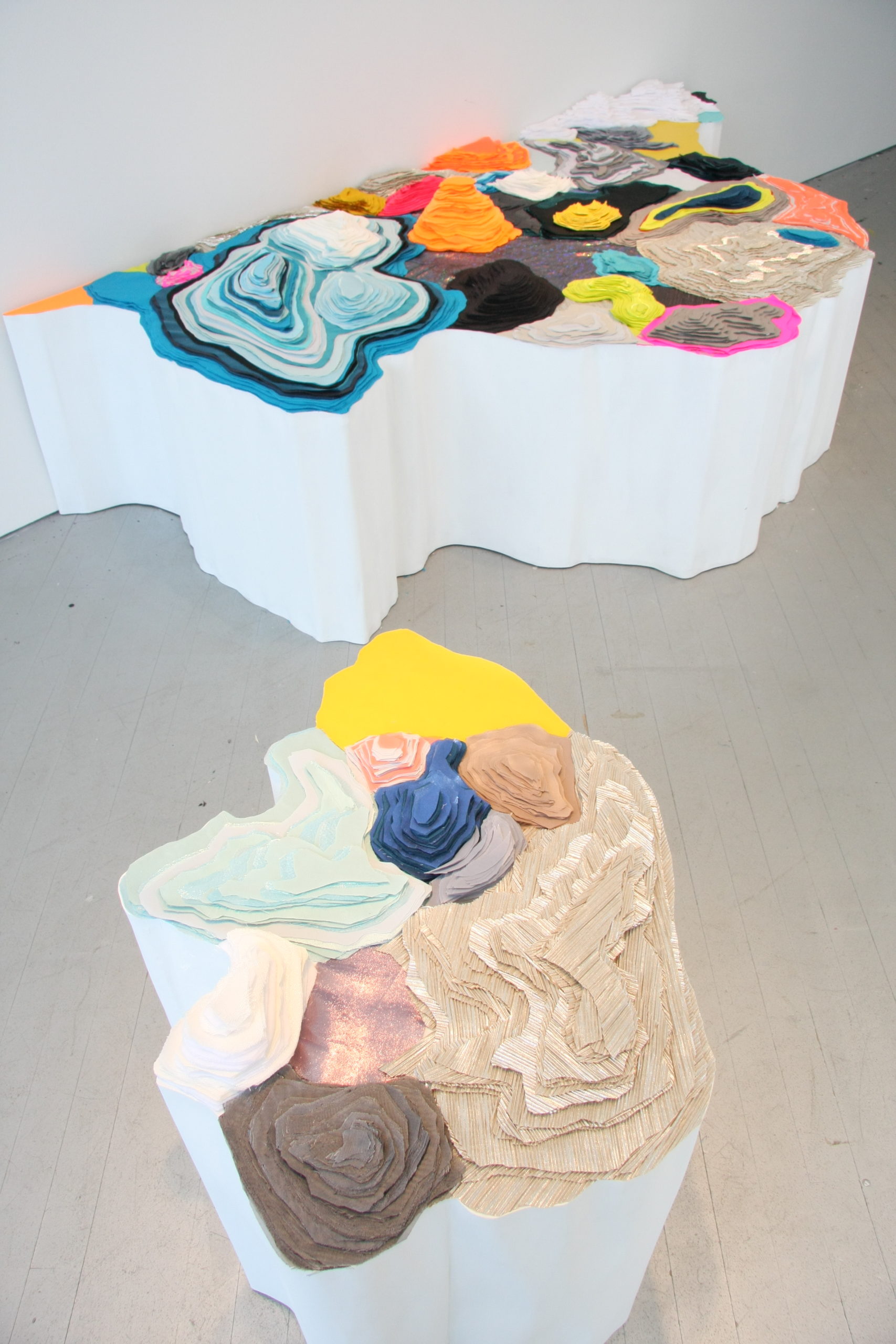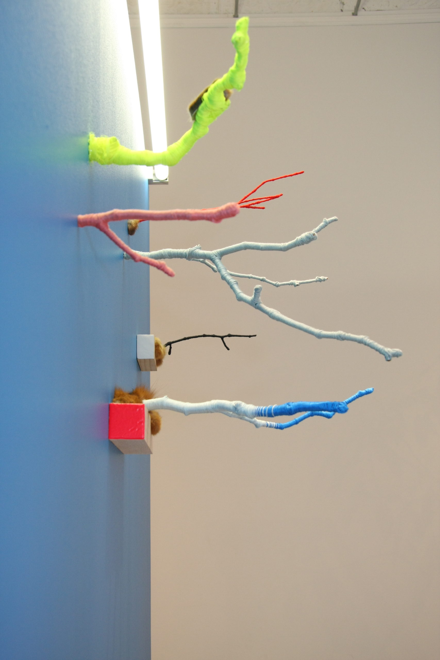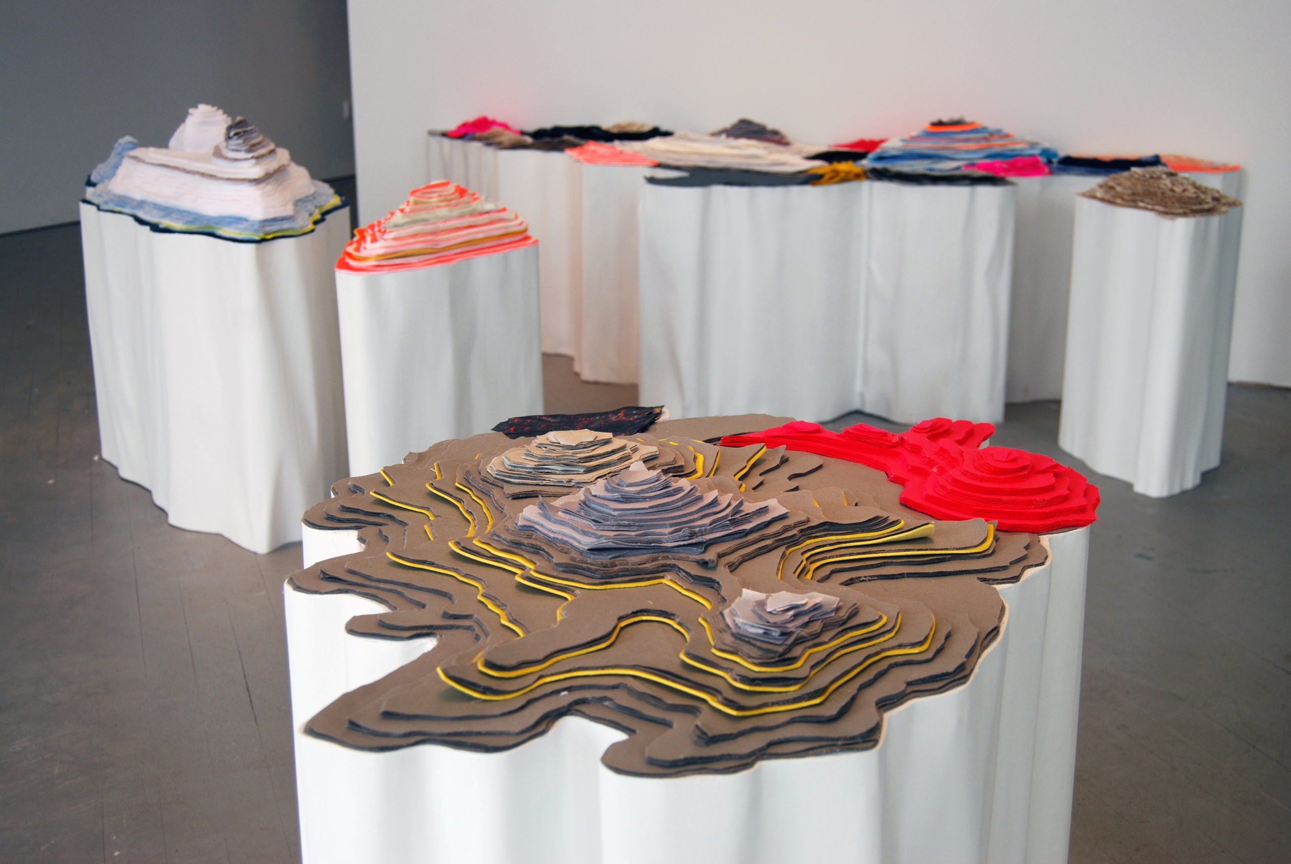 In my first solo exhibition, Natural Deviations, I reinterpreted the experience of a trip to Iceland through a spatial installation. Stratified landmasses made of cut fabric and plants wrapped in technicolor thread represent an otherworldly landscape pieced together from memories like snapshots of a dream.