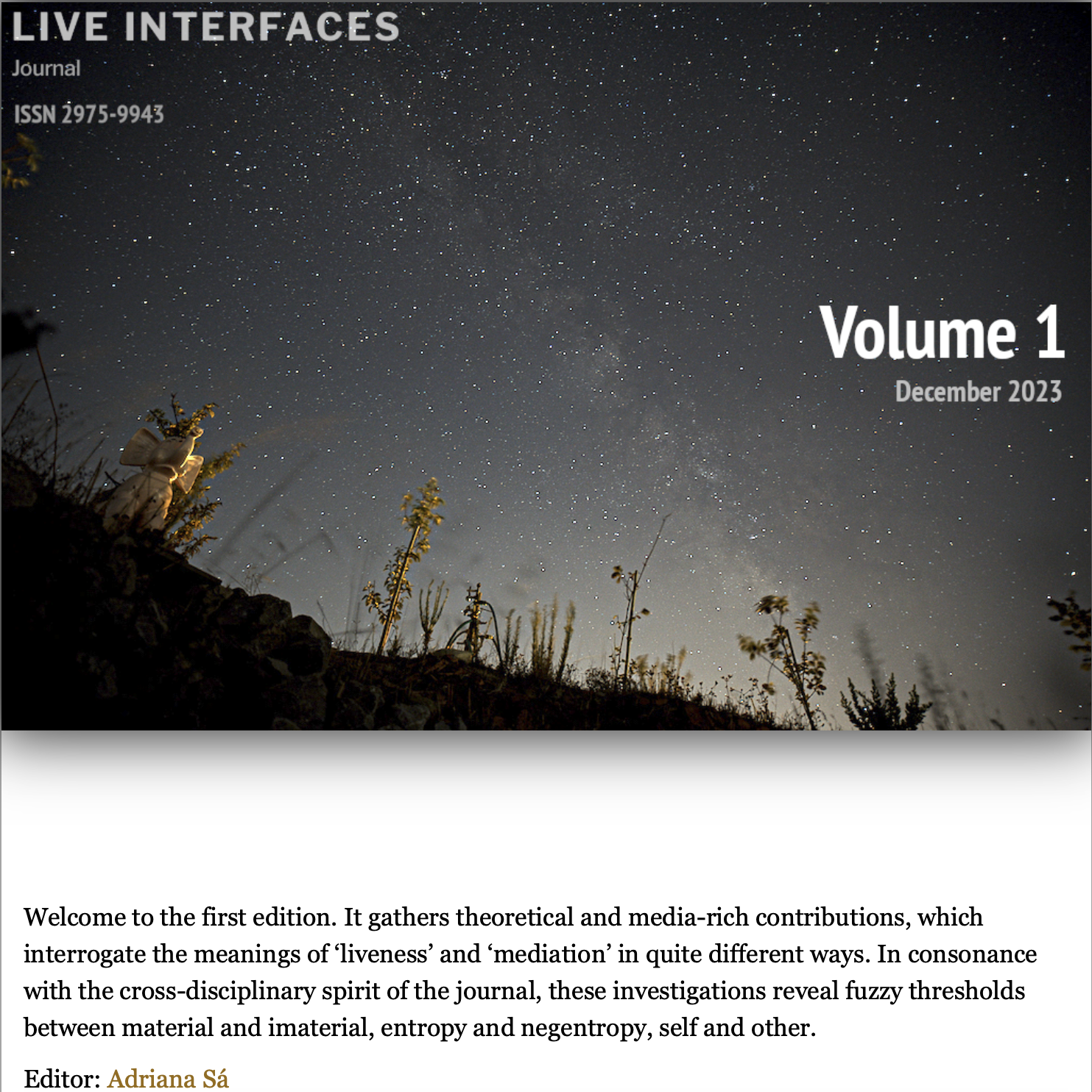 Live Interfaces is an open access, peer-reviewed and media-rich journal that aims to reflect on how specific understandings of ‘liveness’, ‘immediacy’, ‘timing’ and ‘flow’ manifest in performance with creative media, be they physical, electronic, digital or hybrid. It seeks to expose and discuss how different technologies and creative processes might convey original approaches to and/ or alienation from the physical body and the natural environment.