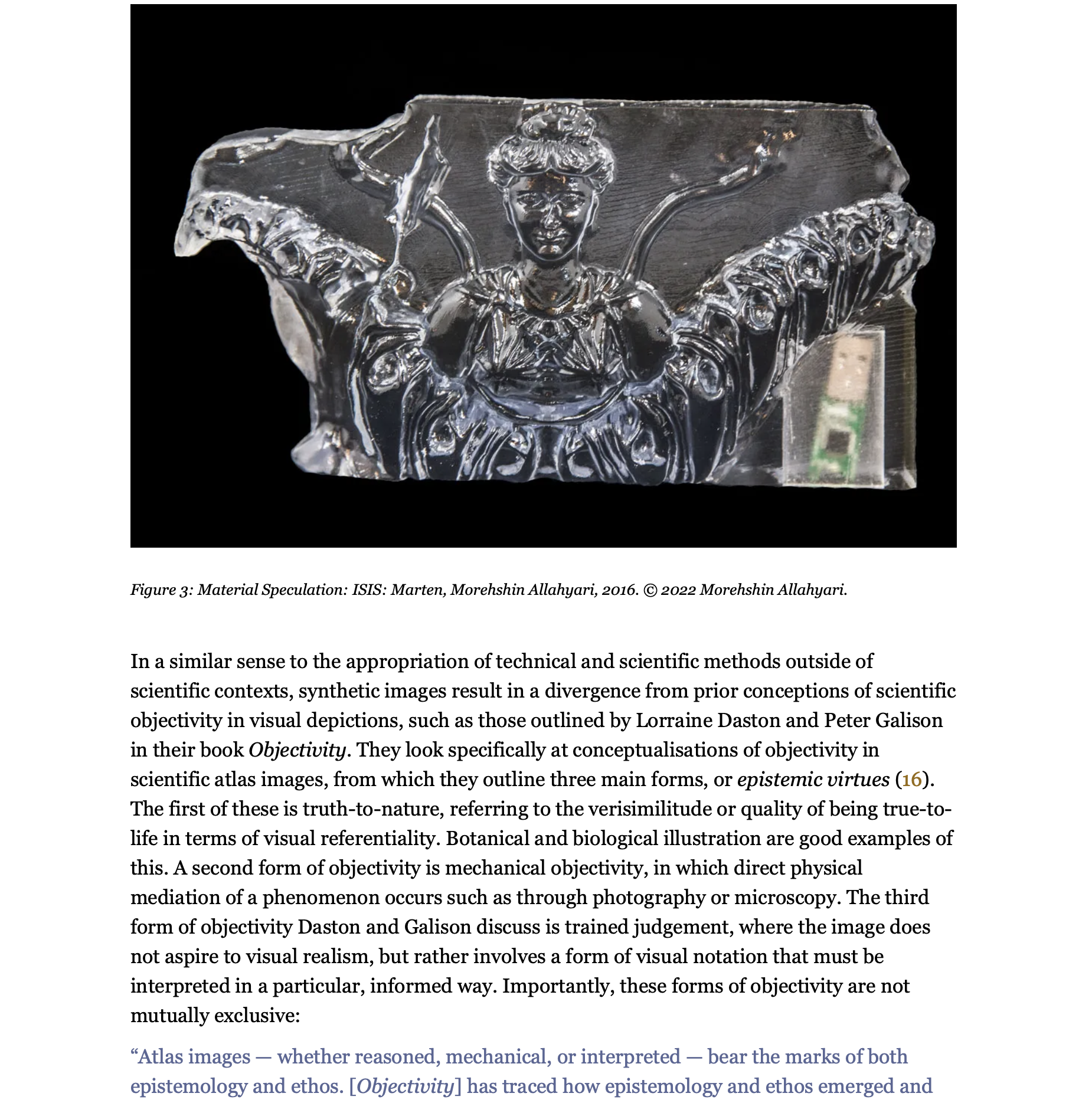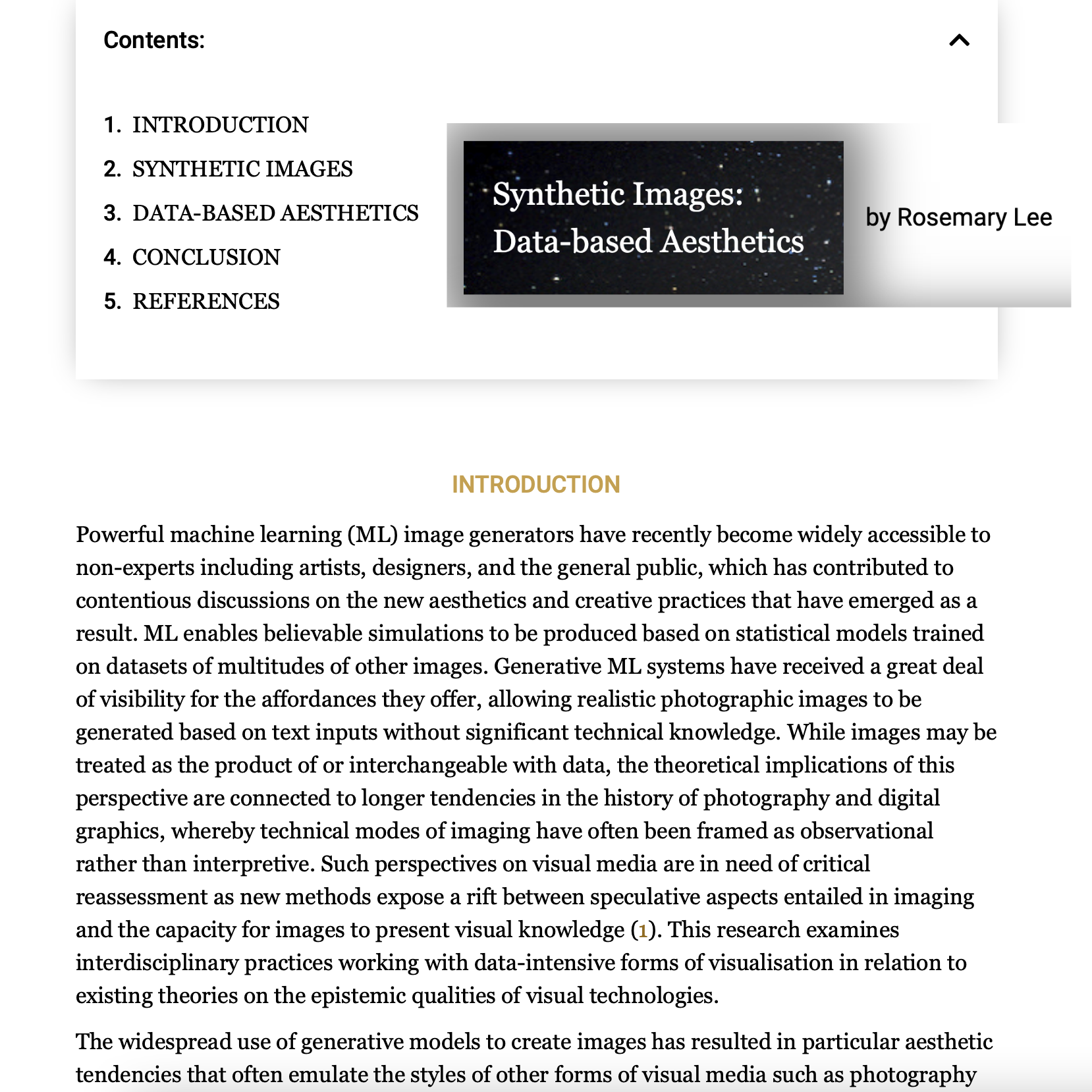 Powerful machine learning (ML) image generators have recently become widely accessible to non-experts including artists, designers, and the general public, which has contributed to contentious discussions on the new aesthetics and creative practices that have emerged as a result. ML enables believable simulations to be produced based on statistical models trained on datasets of multitudes of other images. Generative ML systems have received a great deal of visibility for the affordances they offer, allowing realistic photographic images to be generated based on text inputs without significant technical knowledge. While images may be treated as the product of or interchangeable with data, the theoretical implications of this perspective are connected to longer tendencies in the history of photography and digital graphics, whereby technical modes of imaging have often been framed as observational rather than interpretive. Such perspectives on visual media are in need of critical reassessment as new methods expose a rift between speculative aspects entailed in imaging and the capacity for images to present visual knowledge (Drucker 2020). “Synthetic Images: Data-based Aesthetics” examines interdisciplinary practices working with data-intensive forms of visualisation in relation to existing theories on the epistemic qualities of visual technologies.