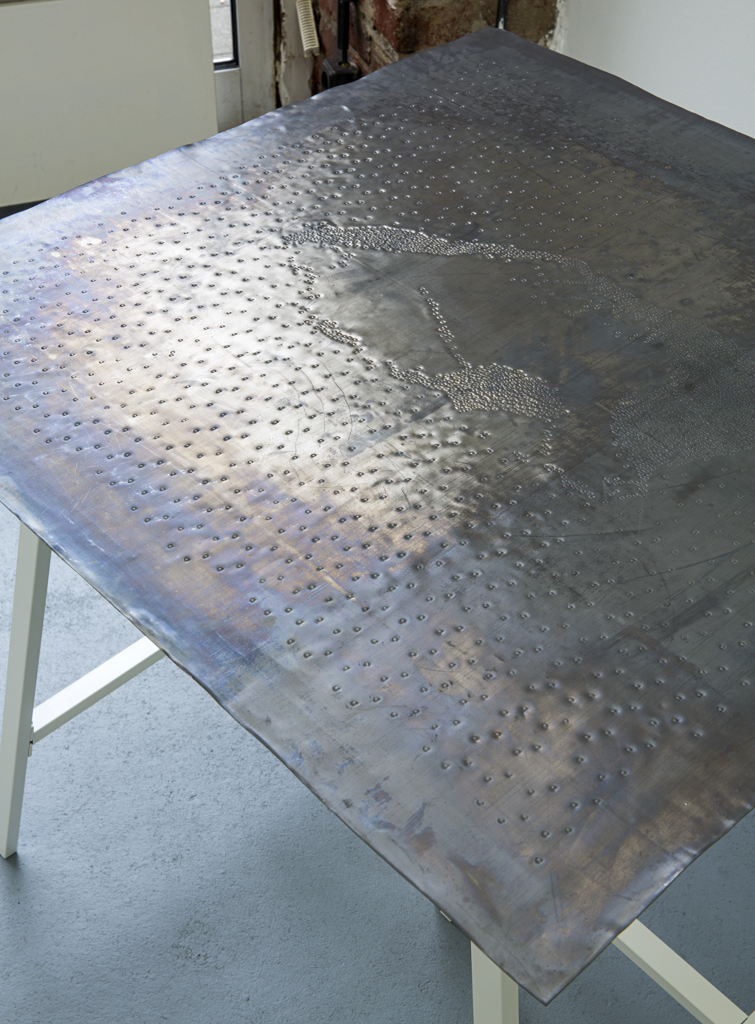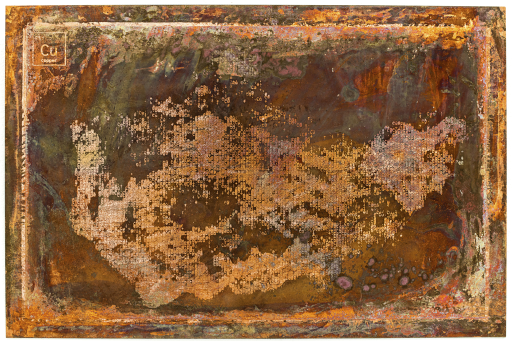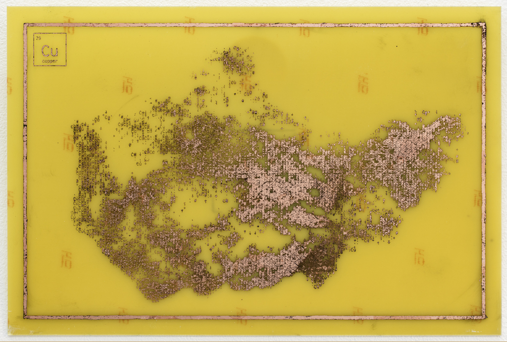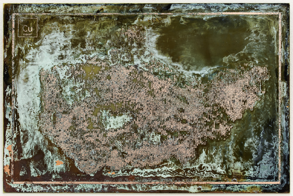 Deconstructing technology down to its components, The Typesetter’s Ruminations draws connections between electronics, their mineral origins, and alphanumeric code. In text-based images composed of chemical formulas for common elements used in electronic devices, she explores the relationship of coding to the materiality of media. Using the substrate as a medium of expression, the works in the exhibition examine how memory is embedded in material: encoded in silicon, gold, and other elements. The artist mines poetry out of chemical composition and the structure of substances, revealing parallels between computer codes, chemical formulas, and human language.